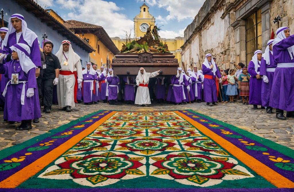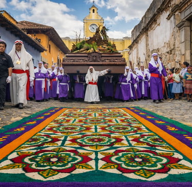 Antigua Guatemala se transforma cada año durante la Semana Santa. Sus calles empedradas se convierten en escenarios de fe y color, donde miles de personas se reúnen para ver procesiones, alfombras de aserrín y pasos religiosos que datan de siglos.